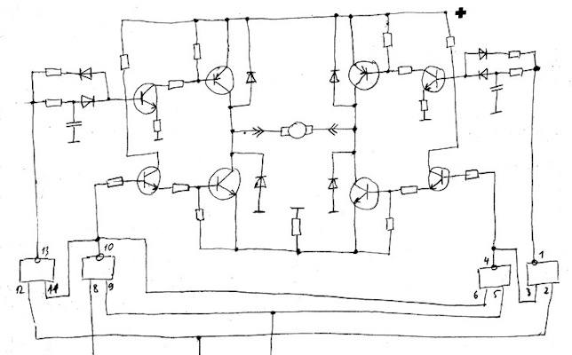 Ces composants confirment l'usage d'un circuit type de pilotage de moteur : le pont H. Le principe est simple : 4 transistors sont commandés 2 par deux "en diagonale" pour alimenter le moteur dans un sens ou dans l'autre. C'est un inverseur commandé. Le schéma de principe type le plus proche de ce que voit sur l'appareil est le suivant :