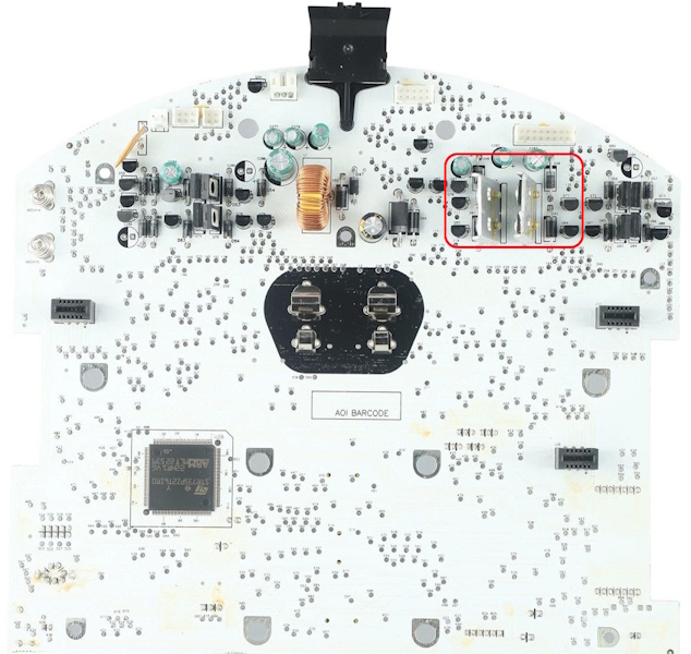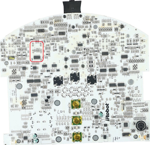 Je récupère un 2ème exemplaire en mauvais état, je le nettoie, remplace la batterie et il est reparti ... pendant quelques temps. Un jour de pluie, la porte de sortie était ouverte et malgré ses capteurs, l'aspirateur est sorti en descendant le seuil de 5 cm de haut et est parti aspirer les pavés le long de ma façade ! Après cette évasion, la brosse centrale principale ne tourne plus ... Je démonte le tout et essaie de m'y retrouver : la carte centrale est complexe, mais surtout, il n'existe aucun schéma officiel et complet.