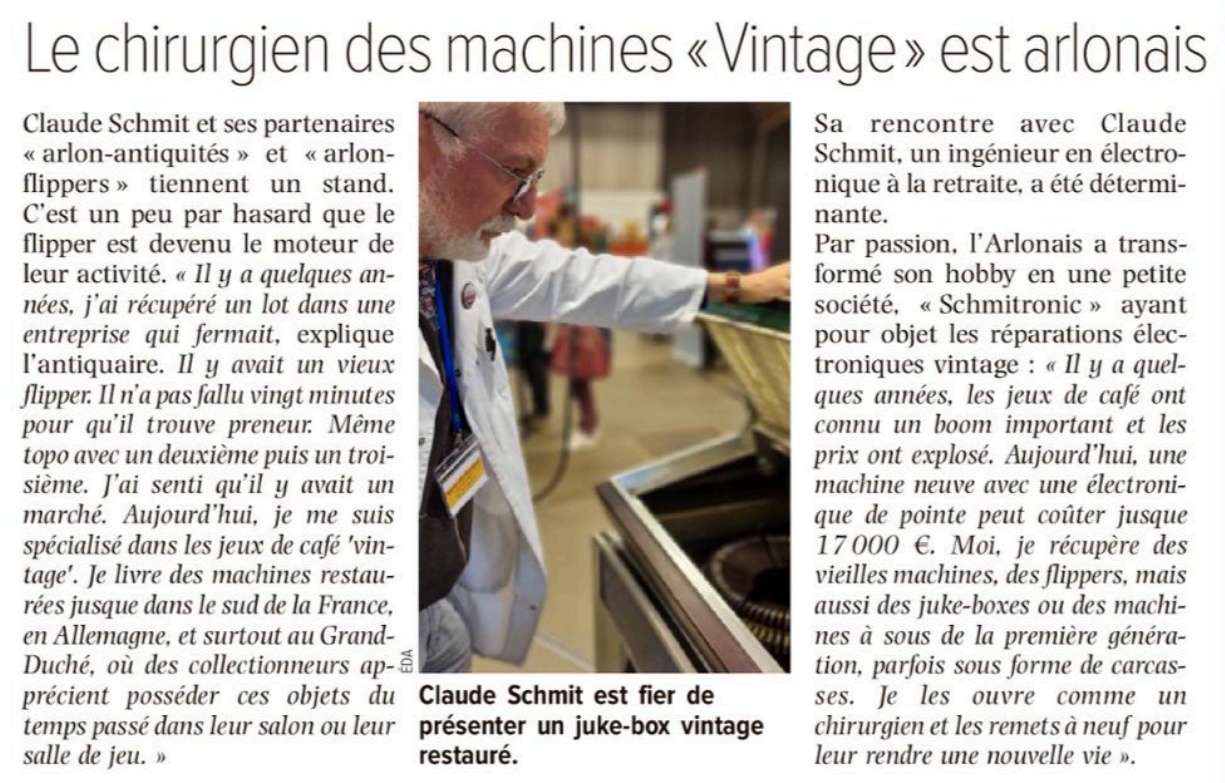 - je travaille avec quelqu'un qui possède un camion avec un lift, nous sommes dans le sud de la Belgique (Arlon). Il peut prendre en charge la restauration de votre machine si vous n'êtes pas situé trop loin (nord France, Belgique, GD Luxembourg). Il vend, rachète et loue également flippers et jukeboxes.