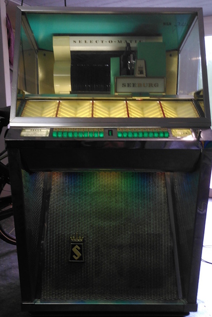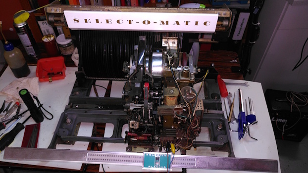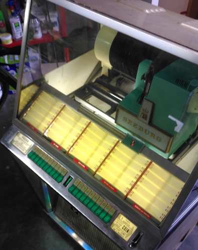 Arrive une machine plus ancienne que d'habitude, un Seeburg L100 de 1957. Elle a une histoire intéressante : le propriétaire belge a travaillé aux USAs quelques temps et avant de rentrer il a acquis la machine et l'a fait livrer en Belgique. Mais comme cette machine est prévue pour fonctionner aux USAs, elle fonctionne en 115V ET en 60Hz, et pas 50Hz comme en Europe. Donc un transfo pour réduire la tension secteur ne suffira pas, le disque tournera trop lentement de 16% à cause de la différence de fréquence !
