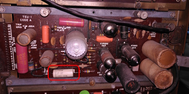Plus grave, après sélection au clavier, le phonographe balaie mais ne sélectionne pas que le disque demandé. Si je demande A1, il joue A1, C1, E1, ... tous les disques en 1 de la face A. Pareil si je fais F8, j'ai toutes les faces B en 8 : B8, D8, F8, ... Aïe, l'architecture de cette machine ne m'est pas familiaire, l'électronique est à tubes, montée sur plusieurs circuits imprimés enchâssés dans une porte à l'arrière de la machine, et pas dans des châssis comme j'ai l'habitude. Les tensions de l'alim de Write-In et de Read-Out sont parfaites, bien régulées par des tubes OA2 (régulateur de tension à cathode froide, ancêtre des Zener). Le test de la pile sur la mémoire Tormat m'indique que c'est la fonction de Write-In qui ne fonctionne pas, puisque la mémoire Tormat est bien lue si activée avec la pile. Les tores sont câblés en matrice, la moitié du courant de renversement magnétique est envoyé dans la ligne et l'autre moitié dans la colonne. Et donc le seul tore magnétisable est celui au croisement de la ligne et de la colonne car c'est le seul qui reçoit la pleine impulsion. Vu que tous les tores de la colonne du chiffre sont sélectionnés, mon hypothèse est que l'impulsion de colonne est trop puissante. Seuls les tores d'une face sont sélectionnés car en fait il y a 2 matrices, une par face. La puissance de l'impulsion dépend d'un condensateur critique qui se charge puis se décharge lors du Write-In. Il doit être de 68nF, or je mesure 84nF. Je le remplace par un 47nF/1200V, et bingo, il ne sélectionne plus que l'unique combinaison encodée au clavier.