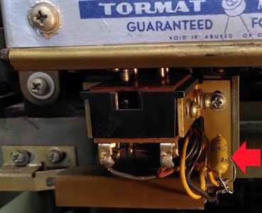 Par expérience, tous les petits arcs électriques causés par des contacts de commande de relais alimentés en tension continue peuvent être étouffés par un petit condensateur (mais qui supporte les hautes tensions) monté en parallèle sur le contact. Je soude un 15nF/400V au plus près du contact qui se trouve sous les palpeurs Tormat et bingo : le silence ! Je dois avouer que j'en ai été le 1er surpris, car cette solution est simple, efficace et peu coûteuse. Beaucoup de machines ont dû avoir le même souci (qui est très désagréable) et pourtant je n'ai vu aucun Service Bulletin sur ce sujet. J'ai même été revoir le schéma complet pour vérifier si un condensateur n'était pas prévu au départ et qu'il aurait disparu sur mon exemplaire, mais non, il n'y a rien. Intéressant comme problème.