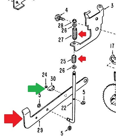 Super, je remonte la tringlerie, qui va provoquer des résistances, je reteste ... et la navette rebloque ! Argh ! En observant attentivement ce qui se passe, je constate que la résistance d'appui sur le contact électrique ne pose pas de problème, par contre quelque chose résiste très fort du côté des 2 ressorts qui font basculer la plaquette guide (N°3) du bras de transfert (qui détermine le sens de pose du bras, face A ou B). Ces 2 ressorts ne sont pas identiques, le court et souple (N° 25) se trouve en dessous et le long et très dur (N° 27) se trouve au-dessus. Ce dernier me semble ne pas convenir, en tous cas c'est lui qui provoque le blocage. Ces 2 ressorts ne servent que d'amortisseurs de mouvements et évitent les à-coups mécaniques. Je trouve et teste avec un ressort plus court et plus souple ... et cette fois c'est bon, l'ensemble fonctionne enfin souplement et correctement !